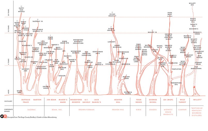 This chart shows the major distilleries operating in Kentucky, Tennessee, and Indiana, grouped horizontally by corporate owner, then subdivided by distillery. Each tree shows the type of whiskey made, and the various expressions of each style of whiskey or mash bill, in the case of bourbons. For instance, Basil Hayden’s is a longer-aged version of Old Grand-Dad, and both are made at the Jim Beam Distillery. Some of this is imprecise. Buffalo Trace has two bourbon mash bills, but it isn’t known which of its many brands are made from each, so this is a rough guess based on online commentary. Willett, formerly only a bottler as Kentucky Bourbon Distillers, has been distilling its own product for about a year; I include the brands that it bottles from other sources for reference. The ages are taken from published age statements if they exist; if they don’t, brands have been plotted in the general area where I would guess they belong.